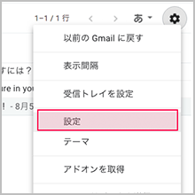 1.Gmailにログインし、右上の歯車のアイコンから「設定」をクリックします。