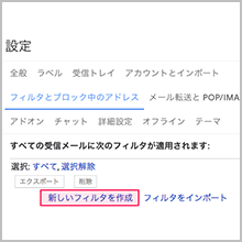 2.メニューの「フィルタとブロック中のアドレス」のタブから「新しいフィルタを作成」をクリックします。