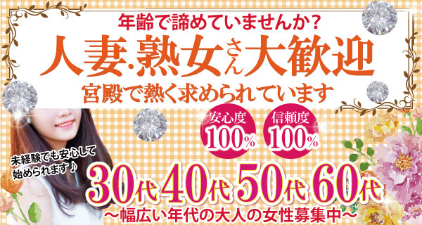 宮殿グループでは30代~60代の人妻・熟女さんが活躍中です♪ お客様の層も同世代になりますので、違和感なくお仕事して頂けます♪
