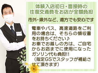 当店は経験者の方、未経験者の方に関わらず最低保証制度があります。1日最低勤務時間6時間~ご勤務して頂ければ必ずお給料が発生するシステムとなっておりますので、安心してご勤務が可能です。