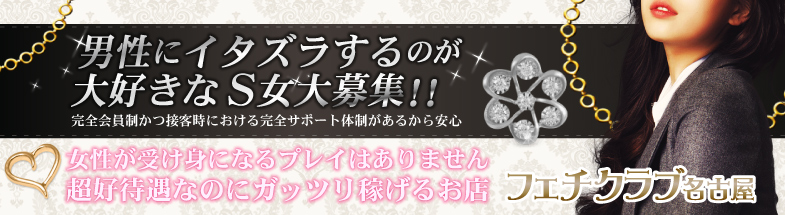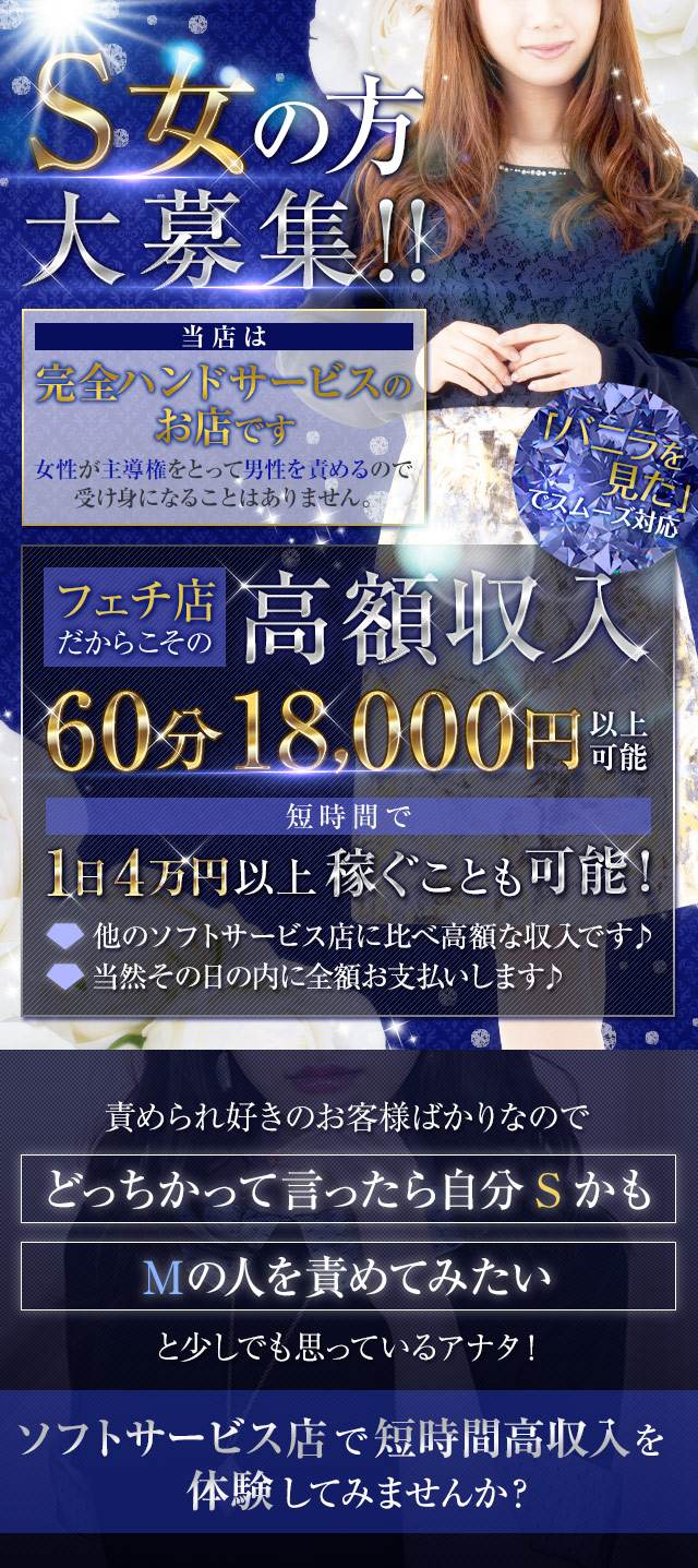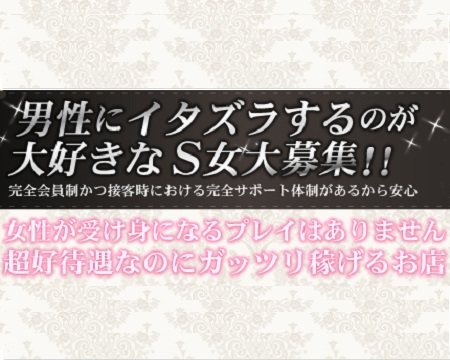 当店では、女性が受け身になるプレイはありません。(S女専門につきM女はいません) 完全会員制かつ接客時における完全サポート体制がありますから、安心して接客できます。 ・どちらかというとSっぽいかも… ・どうせやるんだったら、責めるほうがいい ・責められたり、受け身のプレイが苦手 ・ヘルスは嫌だけど、とにかく稼ぎたい! ・フェチ系M性感のソフトサービス店を探している!